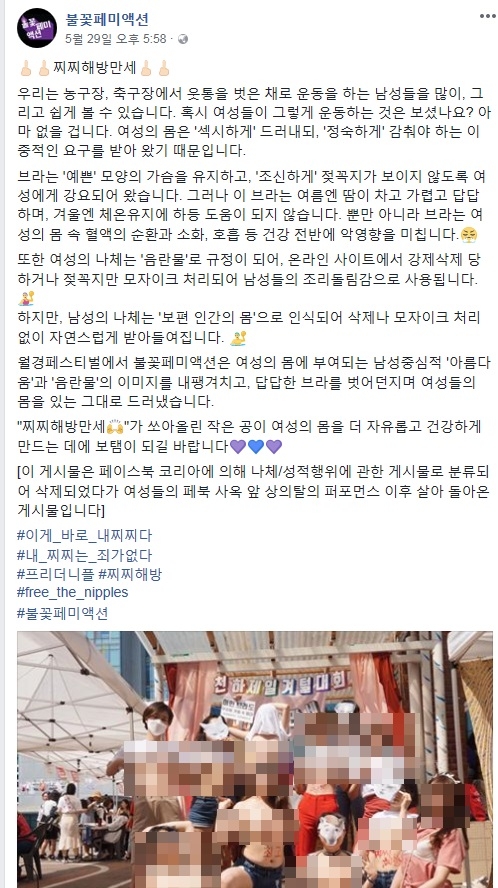ë¶ê½í미ì¡ì ìì íì ê²¨í¸ í¼í¬ë¨¼ì¤ íì´ì¤ë¶ ì¬ì§ ìì ì¬ê³¼ from img.stoo.com 페미니스트 수난…불꽃페미액션 상의 탈의 시위 사진 차단 이어 신지예 벽보 훼손 입력 2018.06.03 14:04 수정 2018.06.03 14:04 클린뷰 찌찌가 먼저였어요!! 아니에요, 보지 보지! 시끌벅적한 이 광경은, 지난 5월 페이스북 코리아 본사 앞에서 우리는 음란물이 아니다 라고 외치며 상의 탈의 시위를 벌였던 불꽃페미액션이 주최한 <가슴해방물결여행 출렁출렁~>의 한 장면이다. 때로는 정부가 성차별적 선전을 철회하도록 압박하는. Liberal feminism)은 자유, 평등, 정의라는 자유주의 가치주 1에 근거하여 여성이 남성과 동등한 법적·사회적·정치적 권리를 획득하여 성평등을 실현할 수 있다는 페미니즘의 한 갈래이다. 1 페미니즘 의 범위를 모든 약자들을 포함시킨 쪽으로 확대한 이후, 2 모든 여성이 겪는 차별은. 단순히 페미니즘 을 넘어서 여성우위의 성차별주의자의 행태를 나치에 비유하여 만든 비하적 용어. 2일 오후 서울 강남구 페이스북코리아 앞에서 여성단체 '불꽃페미액션' 회원들이 페이스북의 성차별적 규정에 항의하는 상의 탈의 시위를 하고 있다. 2016년5월17일 강남역 여성혐오 살인사건부터 시작해서 이 땅에 살아가는 여성으로서 느끼는 모든 폭력과 여성혐오에 저항하는 행동을 하는 모임입니다.